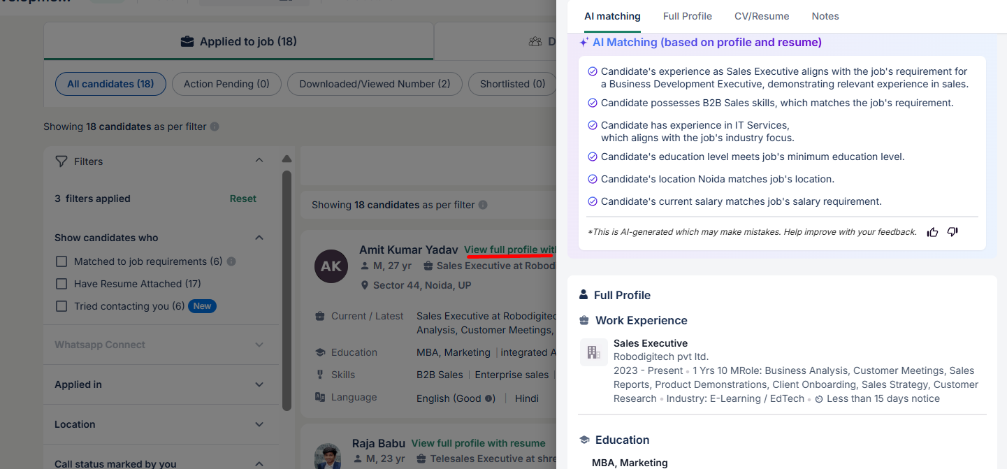 You can check the details of the candidates and view their full profiles. This profile includes information such as: