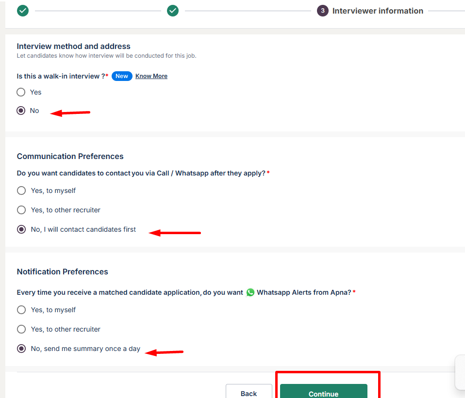 5. Select "No, I will contact candidates first" under Communication Preferences and click on Continue.