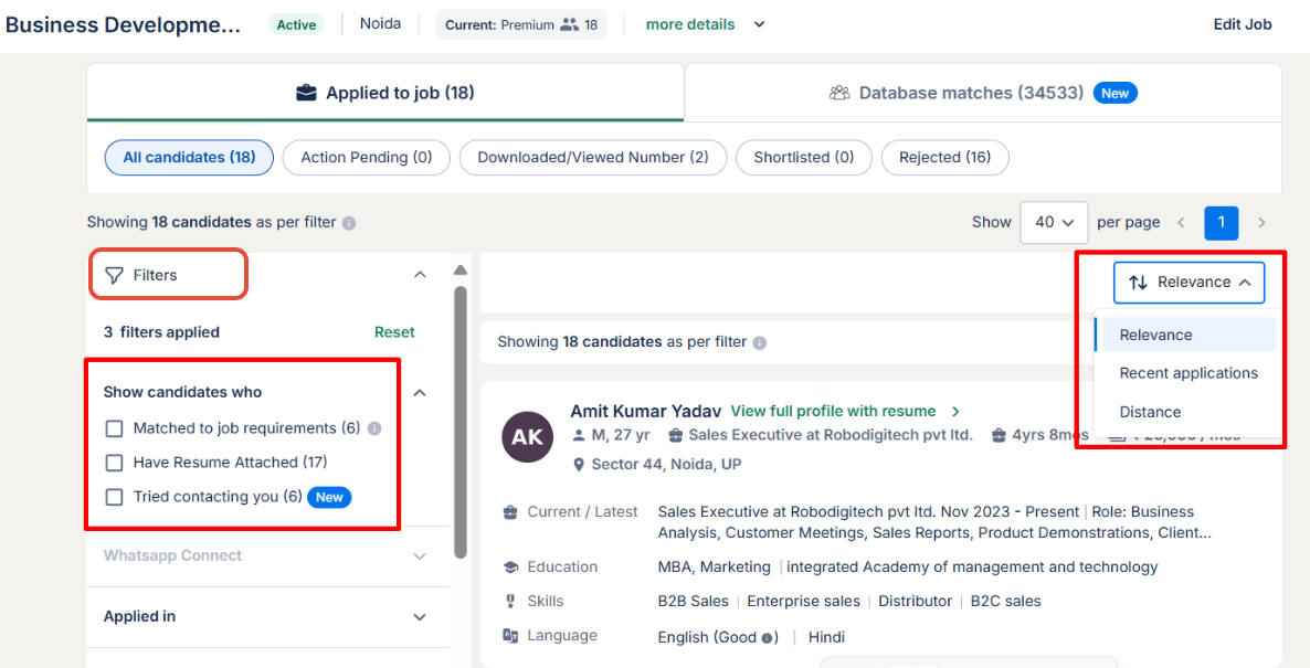 - You can apply filters under the “Matched to job requirements” or " Have resumes attached" or " Tried Contacting you" widget on the left to view the applications that you have received.